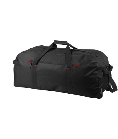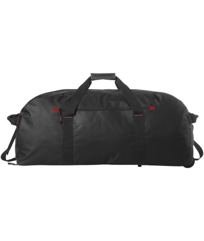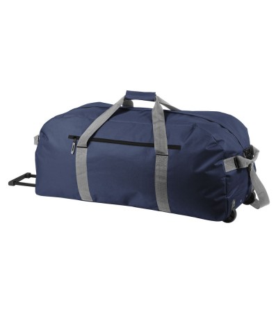 Grand sac de voyage avec compartiment principal zippé, poche avant zippée et roulettes.