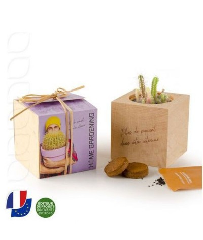 Kit de plantation avec un cube en bois naturel, de la terre de coco et un sachet de graines au choix : Impression du fourreau simple ou version opercule en quadri à votre communication, sur du... Suite dans la description