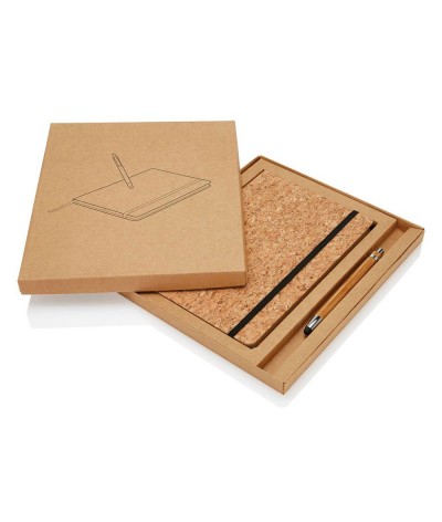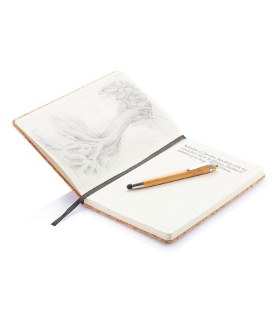 Carnet de notes 60 pages 80g avec couverture en liège naturel. Avec marque page noir. lignes noires. bande élastique noire. Y compris stylo en bambou avec embout stylet et stylo bille.