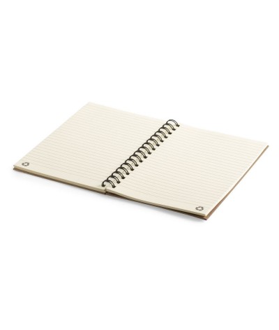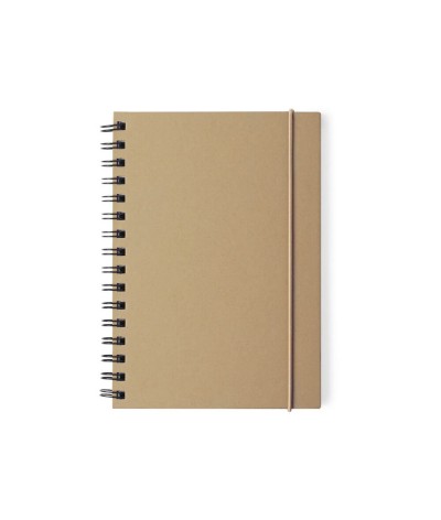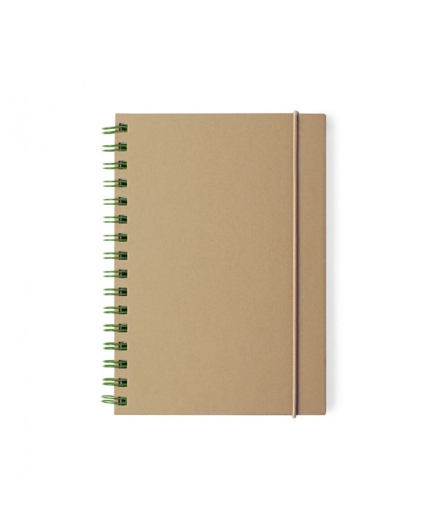 Carnet A5 coloré. Couverture rigide en carton recyclé et élastique de couleur naturelle. Avec 80 feuilles en format rayé et éco-concue.