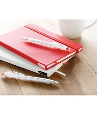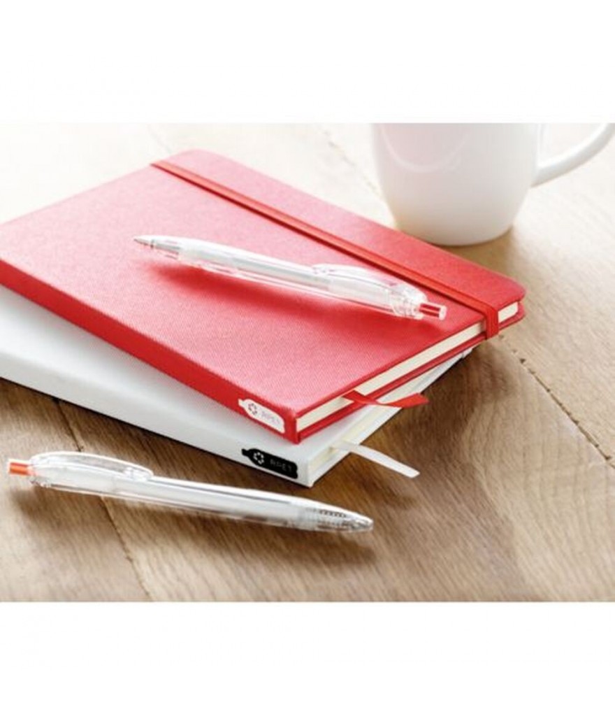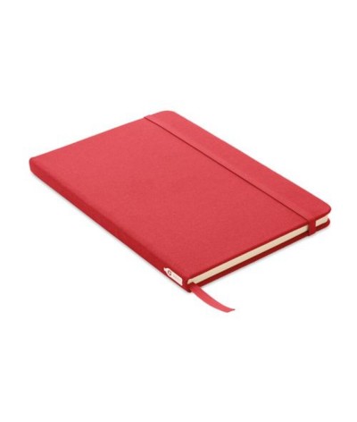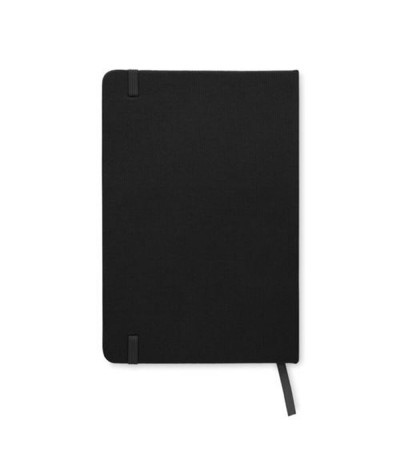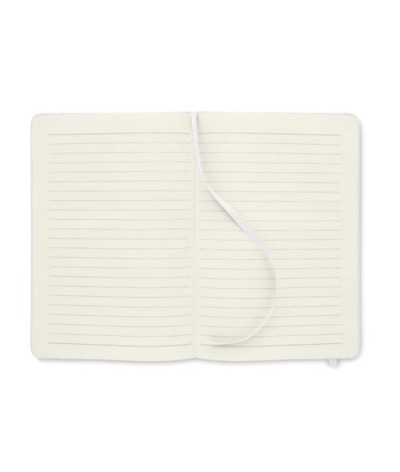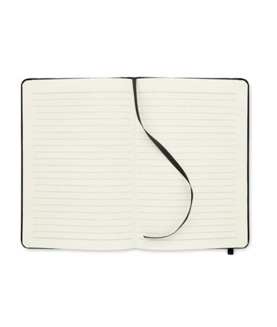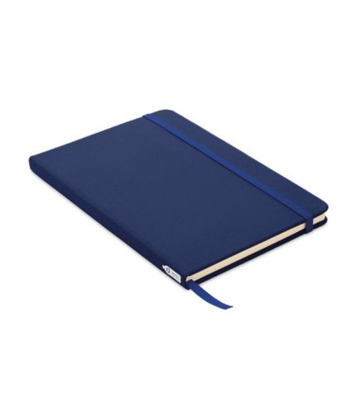 Carnet A5 avec couverture rPET 600D et 80 pages lignées en papier recyclé avec bande élastique et ruban.