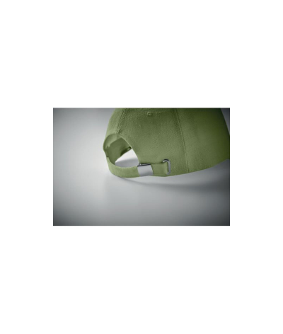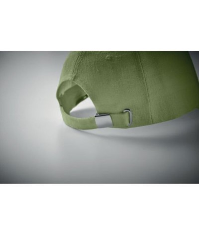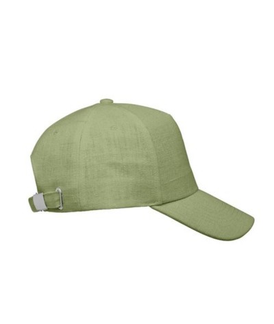 Casquette 5 panneaux en tissu 100% chanvre (370 gr/m²) avec des clips en laiton sur la fermeture à sangle réglable.