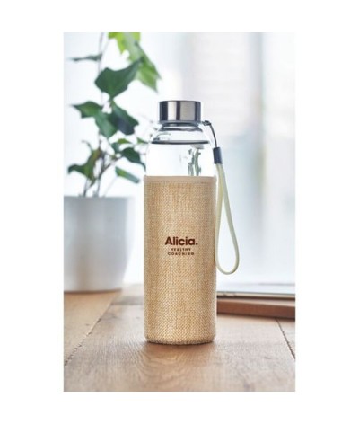 Gourde/bouteille en verre dans une housse en néoprène et jute. Contenance : 500 ml. Ne convient pas aux boissons gazeuses.