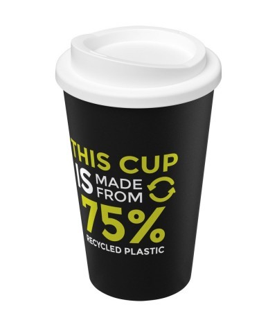 Le gobelet est fabriqué en plastique PP recyclé à 100 % et le couvercle est en plastique PP de qualité alimentaire. Comme le couvercle n'est pas fabriqué à partir de matériaux recyclés, il peut être commandé dans une ample gamme de couleurs différentes. La nuance de noir sur le gobelet peut varier en raison de la nature du matériau recyclé. Capacité de 350 ml.