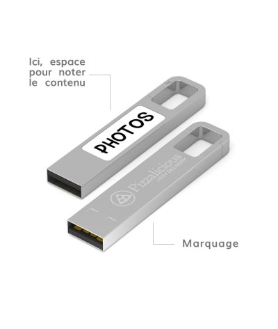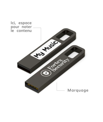 Clé USB mousqueton avec étiquette qui permet d’écrire de manière manuscrite et indiquer le contenu.