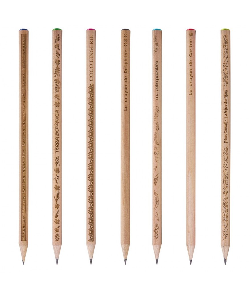 Crayon rond 17,6 cm, sans vernis, tête coupée en bois de cèdre. Personnalisation en gravure laser. Fabriqué en France