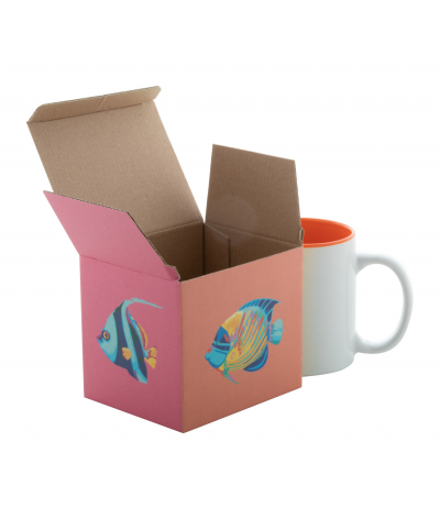 Boîte en carton ondulé 150 g/m2 sur mesure imprimée en quadri pour des mugs de 300 à 350 ml.