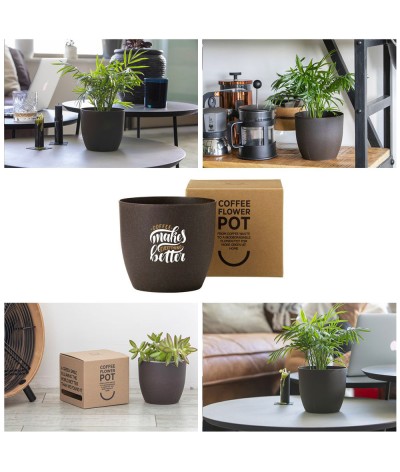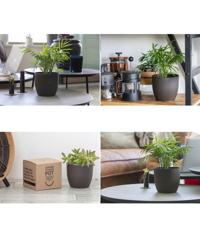 Pot de fleurs entièrement compostable fabriqué à partir du marc de café provenant de la préparation d'une tasse de café.
