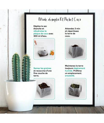 KITS DE SEMIS. Plaquette de coco déshydratée. Sachet de graines standard au choix. Livré en sachet étanche. Produit autoportant. Bandeau.
