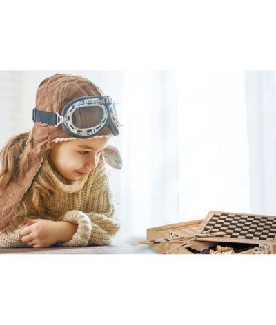 Coffret bois avec 4 jeux (dominos, échecs, mikado,...).