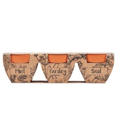 Coffret de 3 pots en terre cuite comprenant 3 graines d'aromates différentes : menthe, persil et basilic.