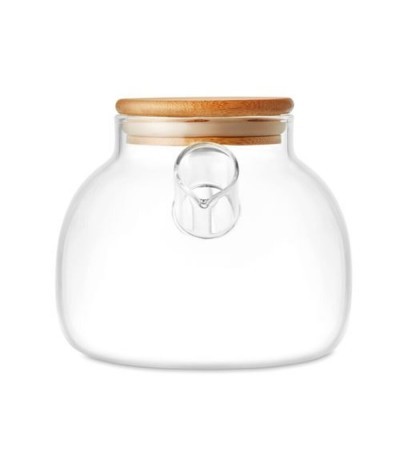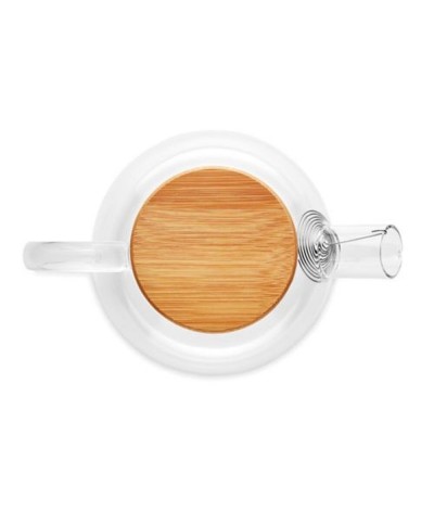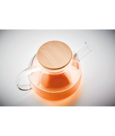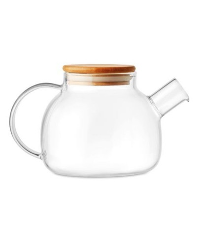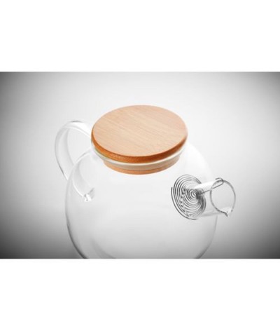 Théière en verre borosilicaté avec infuseur en acier inoxydable et couvercle en bambou.