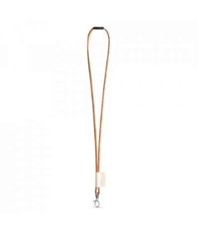 Tour de cou lanyard personnalisé en liège. Complété par les accessoires et extras suivants: étiquette en coton 43 x 15 mm, mousqueton 9 mm, verrou de sécurité.