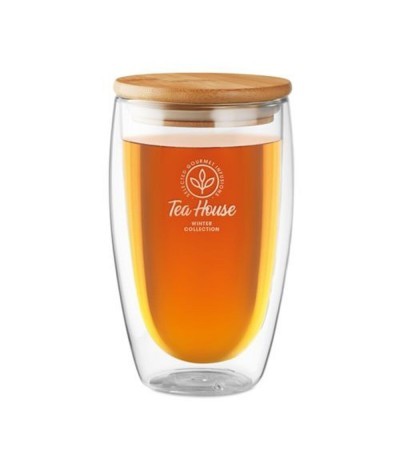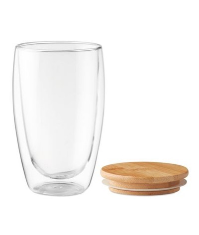 Verre borosilicate à double paroi avec couvercle en bambou et anneau en silicone.