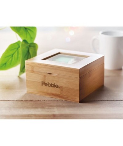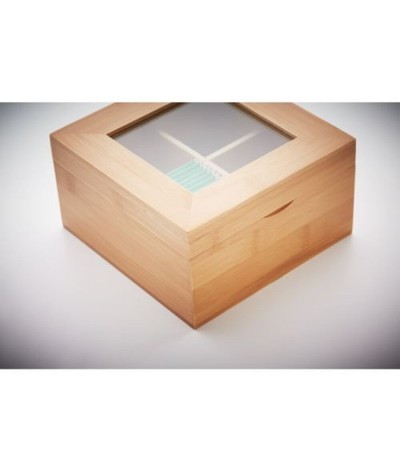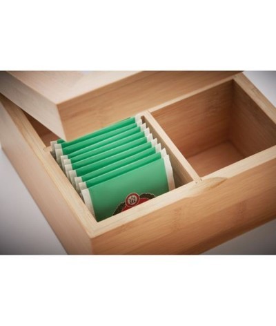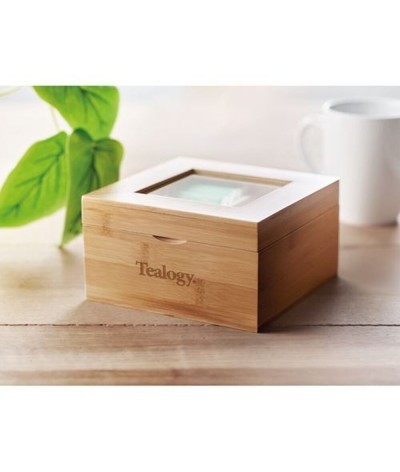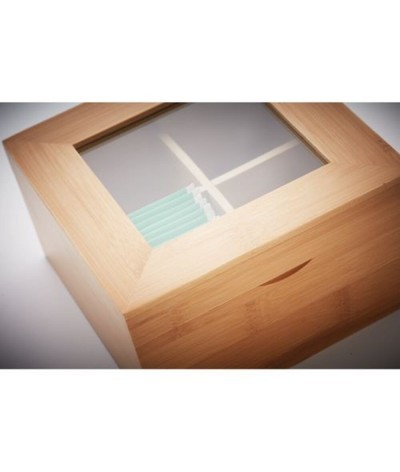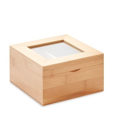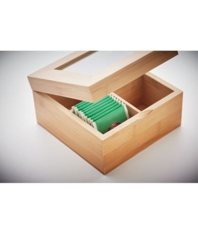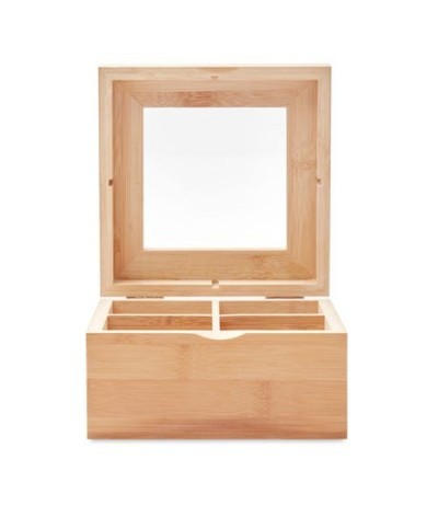 Boîte à thé en bambou avec couvercle verre transparent, avec 4 compartiments pouvant contenir 24 sachets de thé. Le bambou, produit naturel, peut avoir des variations de couleur de taille par... Suite dans la description