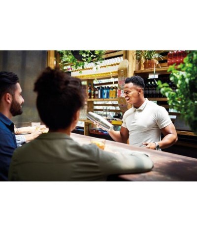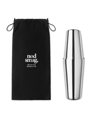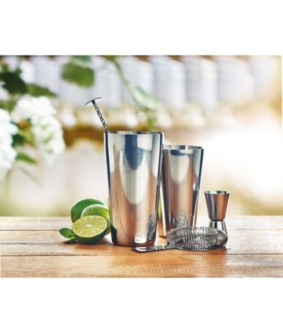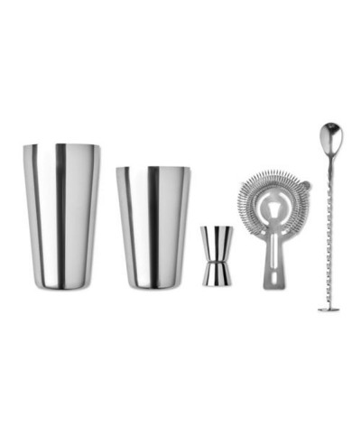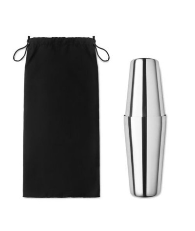 Ensemble à cocktail en acier inoxydable comprenant un shaker de 750 ml, un pichet doseur (30 ml) et un tamis dans une pochette en coton.