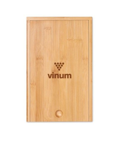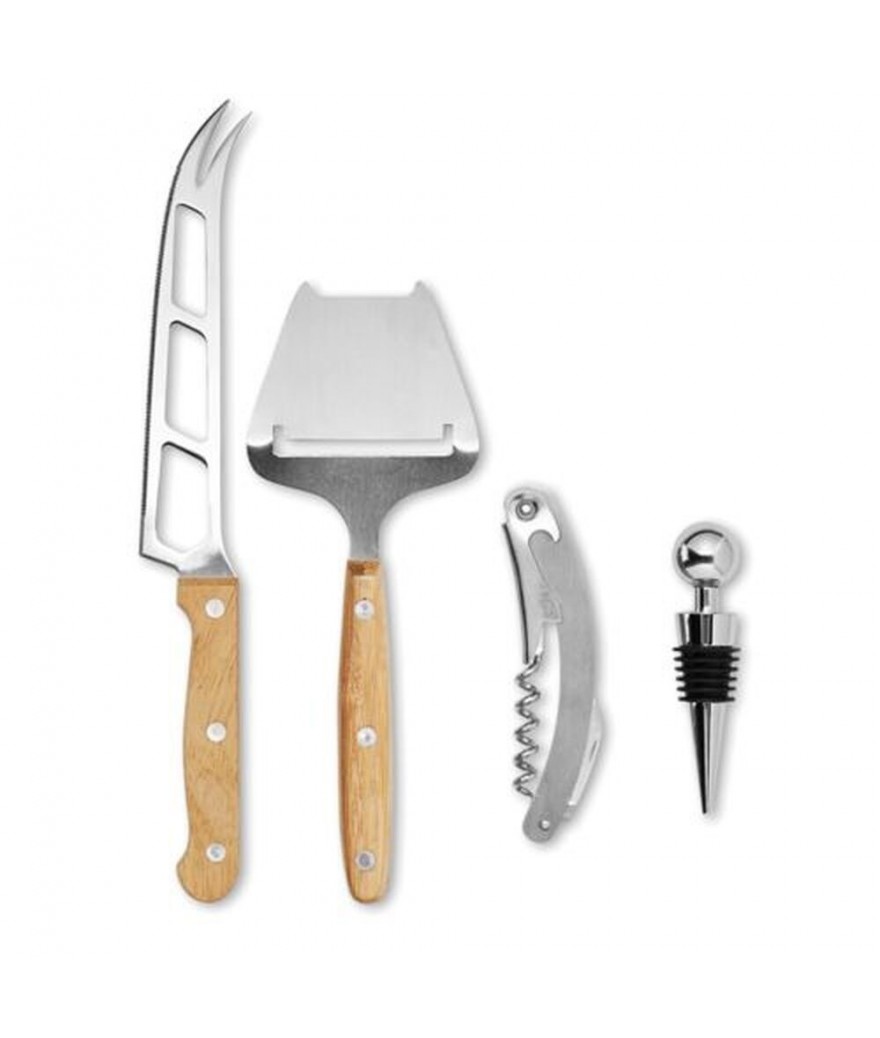 Set à fromage & vin comprenant un couteau en acier inoxydable, un couteau-éplucheur à fromage, un ouvre-bouteille et un stop-goutte. Présentés dans une boîte en bambou.