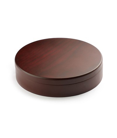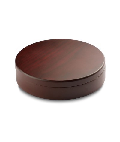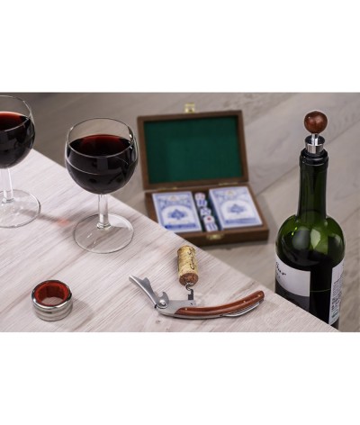 Un ensemble à vin pratique, livré dans une boîte ronde en bois, et composé de 4 éléments: un tire-bouchon, 2 bouchonset un collier anti-goutte.
