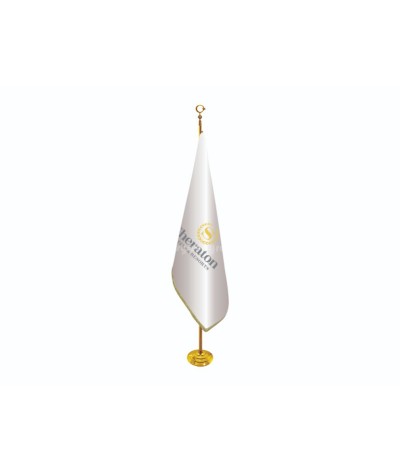 Drapeau de bureau à poser sur un pied de 2m à 2m50 Fabrication : bords crochetés sur les extrémités de mèches sur le côté ou sur le dessus, double piqûre.