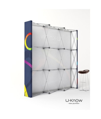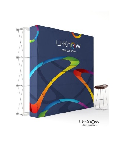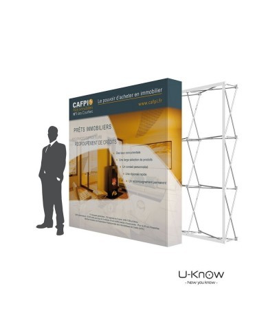 La structure en aluminium se déploie en 2 secondes. Toile polyester fixée par des bandes velcro sur toute sa bordure. L’impression est réalisée en sublimation numérique haute définition.
