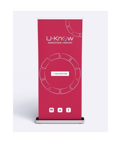 Kakémono publicitaire de type rollup. Mât en métal finition aluminium avec renfort. Affiche personnalisée en bâche PVC 440g/m² norme anti-feu européenne B1. Fixation de l'affiche par double face et par clip pour changement d'affiche rapide. Pieds interchangeables : l'enrouleur est livré d'office avec un seul pied mais un deuxième pied peut être ajouté en option pour une meilleure stabilité. 6 pièces / carton, cartons individuels. Sac de transport en Oxford 300D inclus. Structure disponible sur stock dans notre entrepôt parisien, impression réalisée après validation de la commande