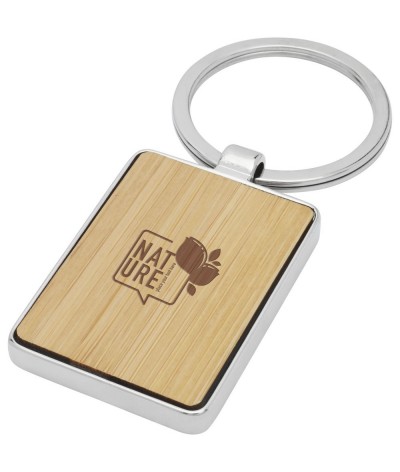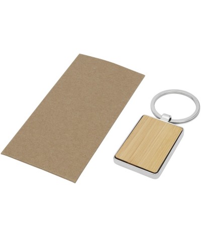 Porte-clés rectangulaire de qualité supérieure en bambou avec habillage métallique en alliage de zinc, livré dans une enveloppe en papier recyclé kraft brun. Les dimensions du porte-clés sont de 5 x 3 cm.