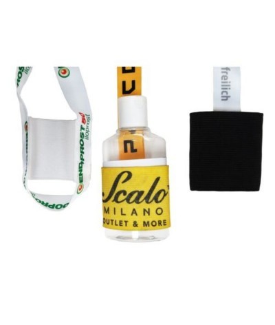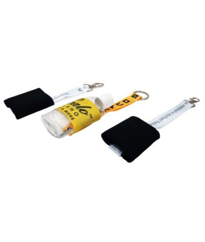 Mini porte désinfectant (format port-clé) en polyester (lisse, recyclé, côtelé ou texturé), personnalisé avec impression transfert en sublimation recto verso sur toute la surface, avec étui élastique disponible en blanc, noir ou personnalisé.