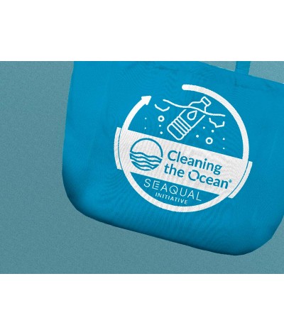 Sac de plage fabriqué à partir de coton recyclé et de matière des océans SEAQUAL , un matériau issu de déchets plastique collectés en mer pour la lutte contre la pollution plastique (*).