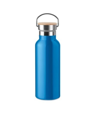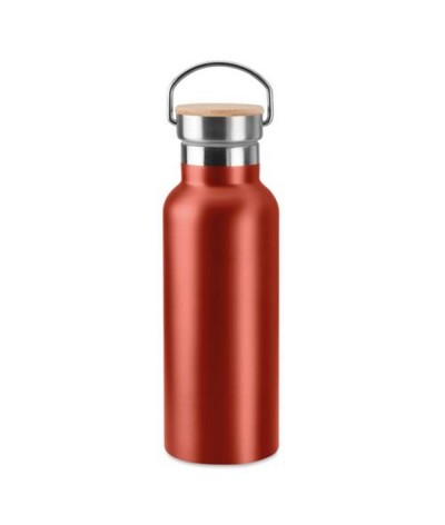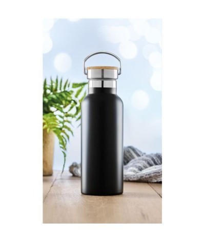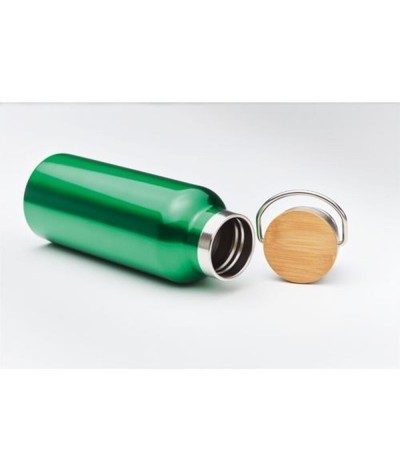 Bouteille isotherme à double paroi en acier inoxydable avec bouchon en bambou et poignée. Antifuite. Contenance 500 ml. Existe aussi dans d'autres couleurs.