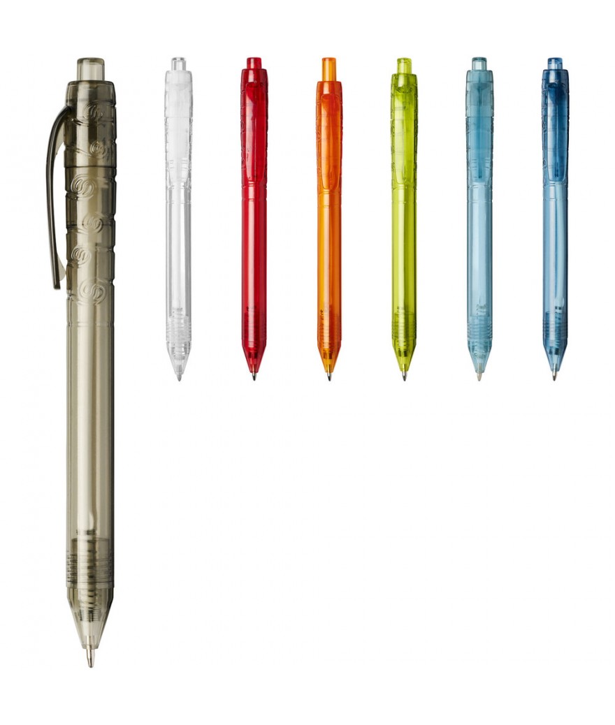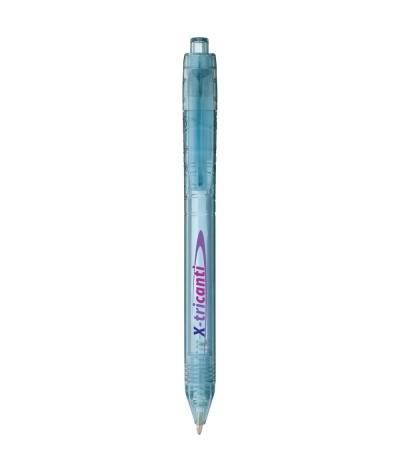 Stylo bille rétractable au corps transparent. Le corps est fabriqué à base de bouteilles d'eau recyclées, réduisant ainsi la quantité de déchets plastiques.