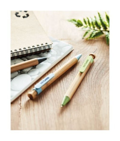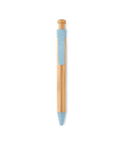 Stylo bille avec poussoir et corps en bambou, attributs biosourcés à base de paille de blé. Encre bleue.
