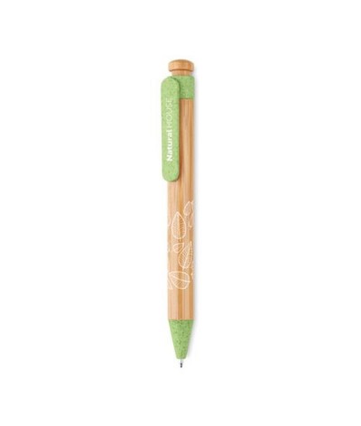 Stylo bille avec poussoir et corps en bambou, attributs biosourcés à base de paille de blé.