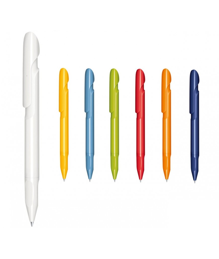 Stylo à bille rétractable brillant opaque en ABS fabriqué à partir de + 95% de matière recyclée (rebuts, déchets industriels et produits du quotidien).