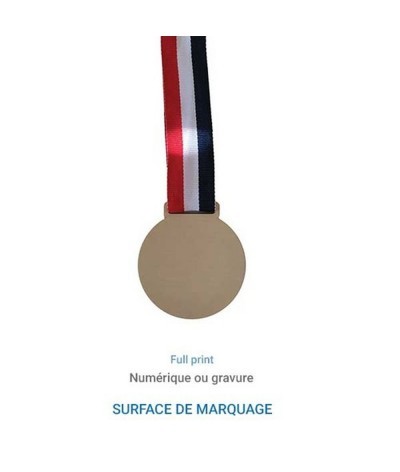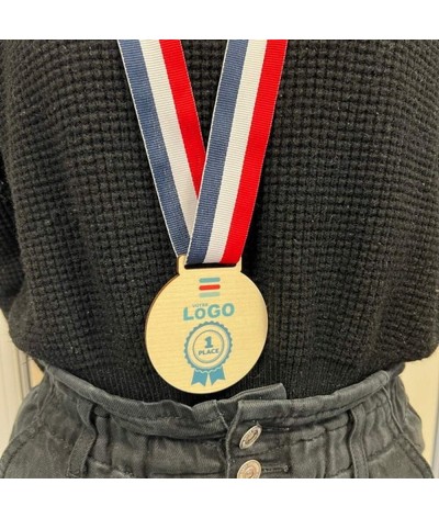 Médaille française plaqué bois érable de 50mm x 3mm - Impression par gravure laser ou Numérique - Livré avec son ruban polyester tricolore Bleu, Blanc, Rouge.